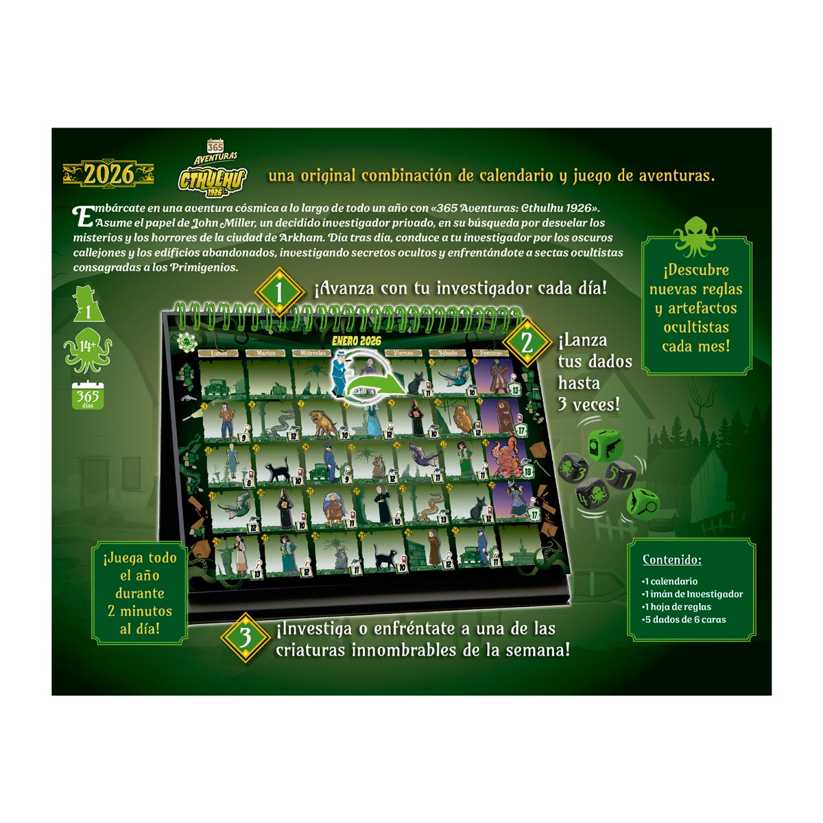 Diseñado por Juhwa Lee e ilustrado por Radja, este calendario está pensado para disfrutar en solitario, a partir de 14 años. Jugar solamente llevará dos minutos al día, pero el desafío completo se prolonga a lo largo de los 365 días del año. Para marcar el día en curso, usarás una figura de investigador y un imán en la parte trasera de la hoja del mes.